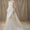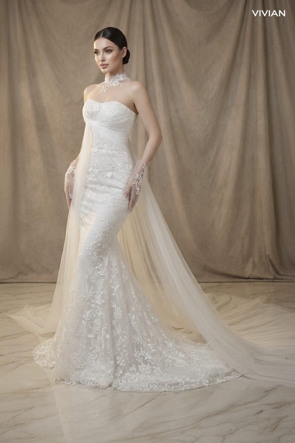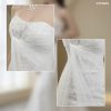 Chiếc váy cưới mang vẻ đẹp ngọt ngào và lãng mạn với chất liệu ren thêu hoa tinh xảo phủ toàn bộ thân váy. Thiết kế cúp ngực trái tim mềm mại giúp tôn lên vòng một quyến rũ, kết hợp cùng dải voan mỏng quấn nhẹ quanh eo và buông dài phía sau tạo hiệu ứng bay bổng, thướt tha. Điểm nhấn đặc biệt là phần cổ choker ren hoa thanh thoát, đồng bộ với găng tay ren nhẹ nhàng, mang đến vẻ duyên dáng và yêu kiều cho cô dâu. Đây là lựa chọn hoàn hảo cho những ai yêu phong cách nữ tính và đầy chất thơ.