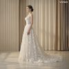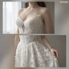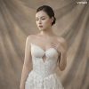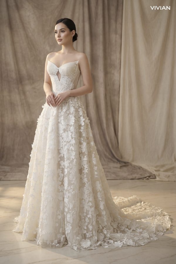 Chiếc váy cưới mang vẻ đẹp trẻ trung và hiện đại với thiết kế cúp ngực trái tim đầy quyến rũ, kết hợp phần cut-out nhẹ giữa ngực tạo điểm nhấn gợi cảm. Toàn bộ thân váy được phủ lớp ren hoa nổi 3D tinh xảo, mang lại hiệu ứng sống động và sang trọng. Dáng váy A xòe nhẹ, vừa giúp tôn dáng vừa mang lại sự thoải mái cho cô dâu khi di chuyển. Đây là mẫu váy lý tưởng cho những cô dâu yêu thích sự ngọt ngào pha chút cá tính.